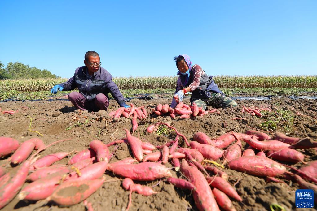 9月21日,在康平縣方家屯鎮十家子村,農民在地里收獲紅薯。