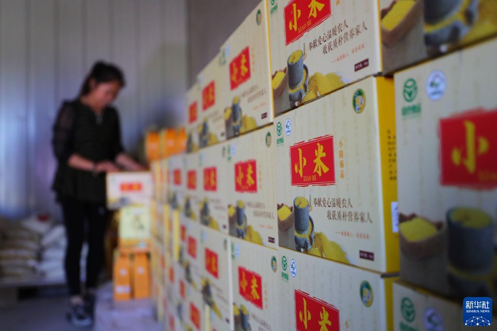 9月21日,在康平縣方家屯鎮東小陵村,農民將封裝好的小米裝箱。