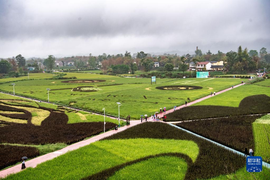 近日,重慶市大足區拾萬(wàn)鎮長(cháng)虹村隆平五彩田園豐收在即,巨型稻田畫(huà)勾勒出金秋壯美景象,吸引眾多游客前來(lái)打卡游玩。