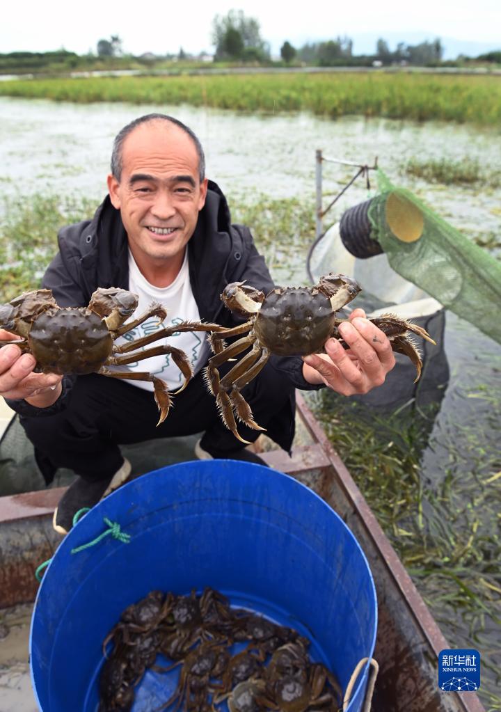 陜西漢中市城固縣龍頭鎮明博生態(tài)養殖基地養殖大戶(hù)王秋林展示捕獲的螃蟹(9月20日攝)。