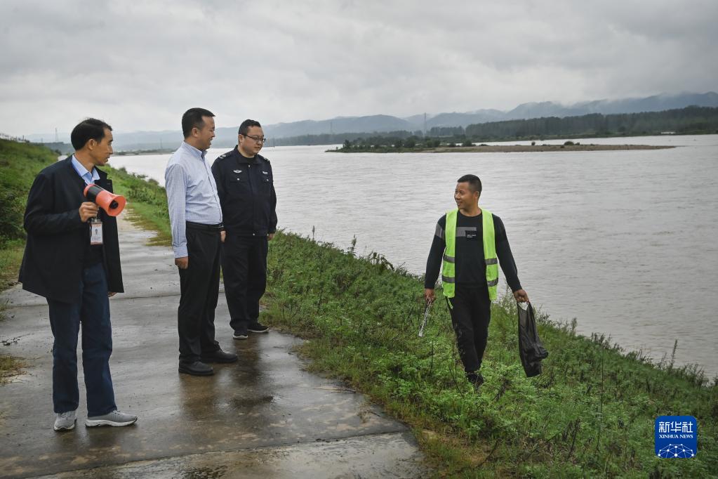 全國優(yōu)秀河(湖)長(cháng)、鎮級河長(cháng)肖利安(左二)與村級河長(cháng)周明(左一)等在漢江邊開(kāi)展聯(lián)合巡河工作(9月20日攝)。