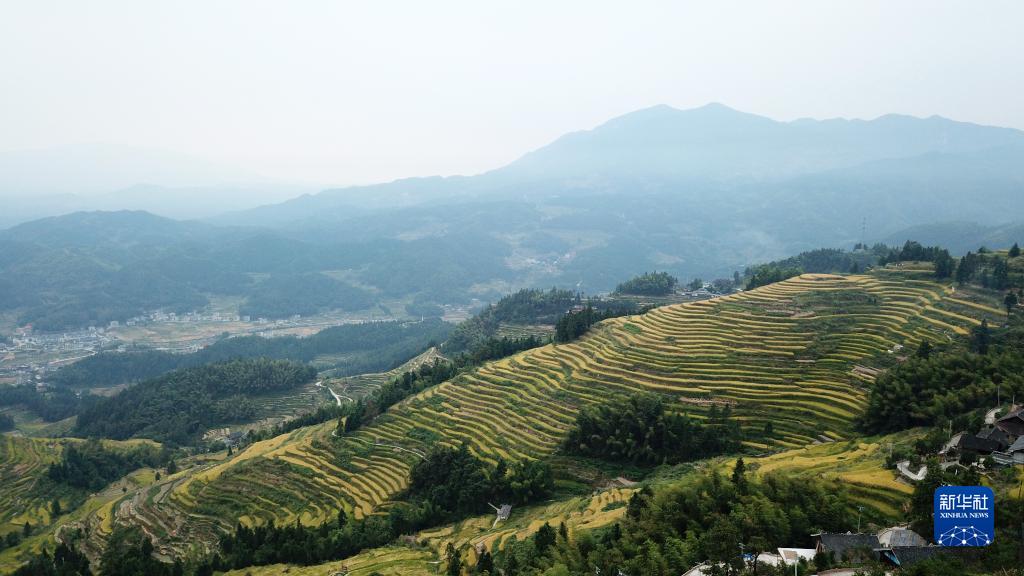 金秋時(shí)節,湖南省婁底市新化縣紫鵲界梯田的水稻進(jìn)入成熟收割期。紫鵲界梯田是世界灌溉工程遺產(chǎn)和全國首批19個(gè)重要農業(yè)文化遺產(chǎn)之一,梯田層層疊疊連綿起伏。