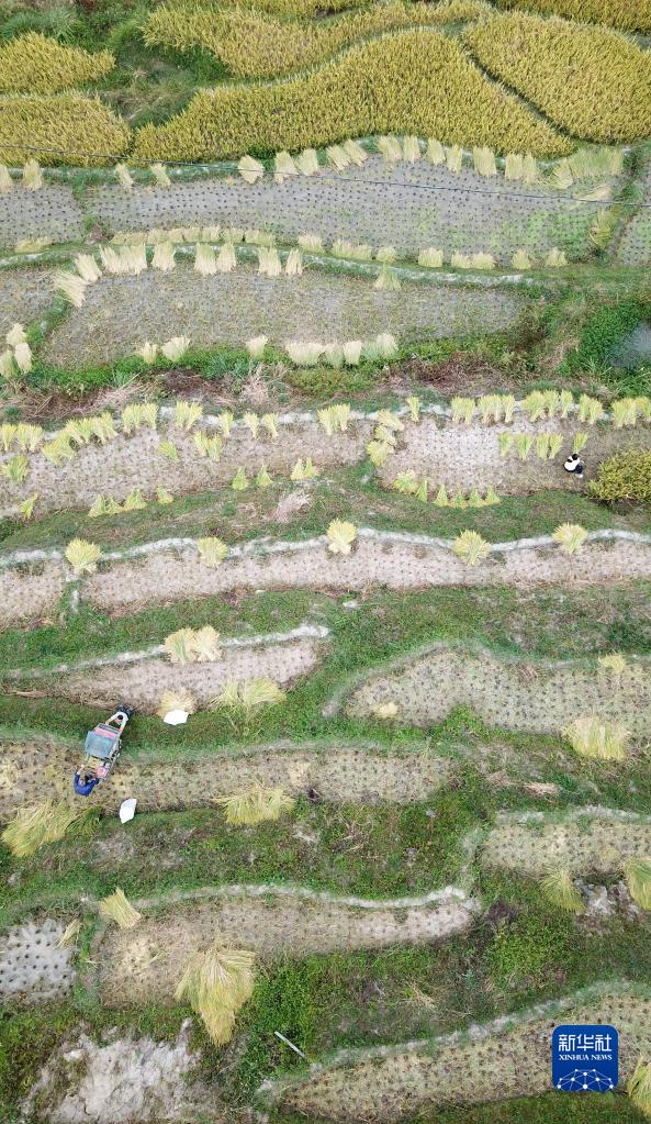 金秋時(shí)節,湖南省婁底市新化縣紫鵲界梯田的水稻進(jìn)入成熟收割期。紫鵲界梯田是世界灌溉工程遺產(chǎn)和全國首批19個(gè)重要農業(yè)文化遺產(chǎn)之一,梯田層層疊疊連綿起伏。