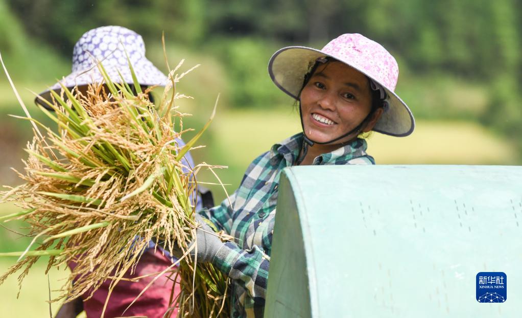9月22日,融水苗族自治縣紅水鄉良隴村村民在田間地頭脫稻谷。
