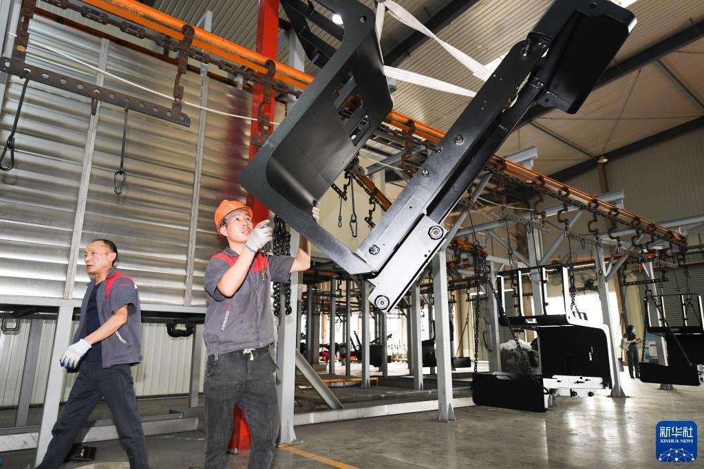9月22日,在位于安吉縣的浙江中力機械股份有限公司,工作人員從自動(dòng)化噴漆流水線(xiàn)上取下零部件。