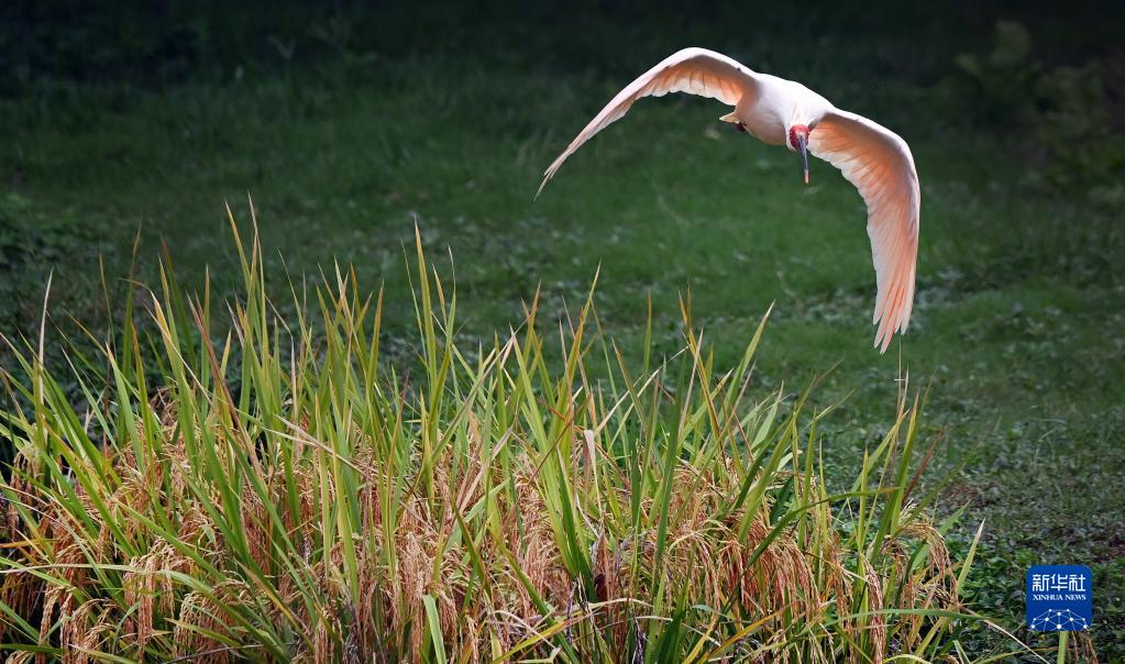 9月22日,一只朱鹮在洋縣謝村鎮的一片稻田中飛舞。