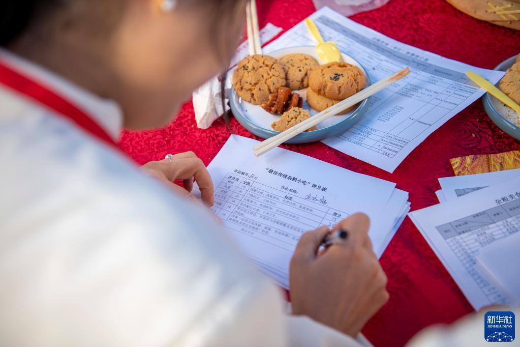 9月22日,在位于山西省忻州市忻府區小檀村的雜糧美食節現場(chǎng),評委在為食品打分。