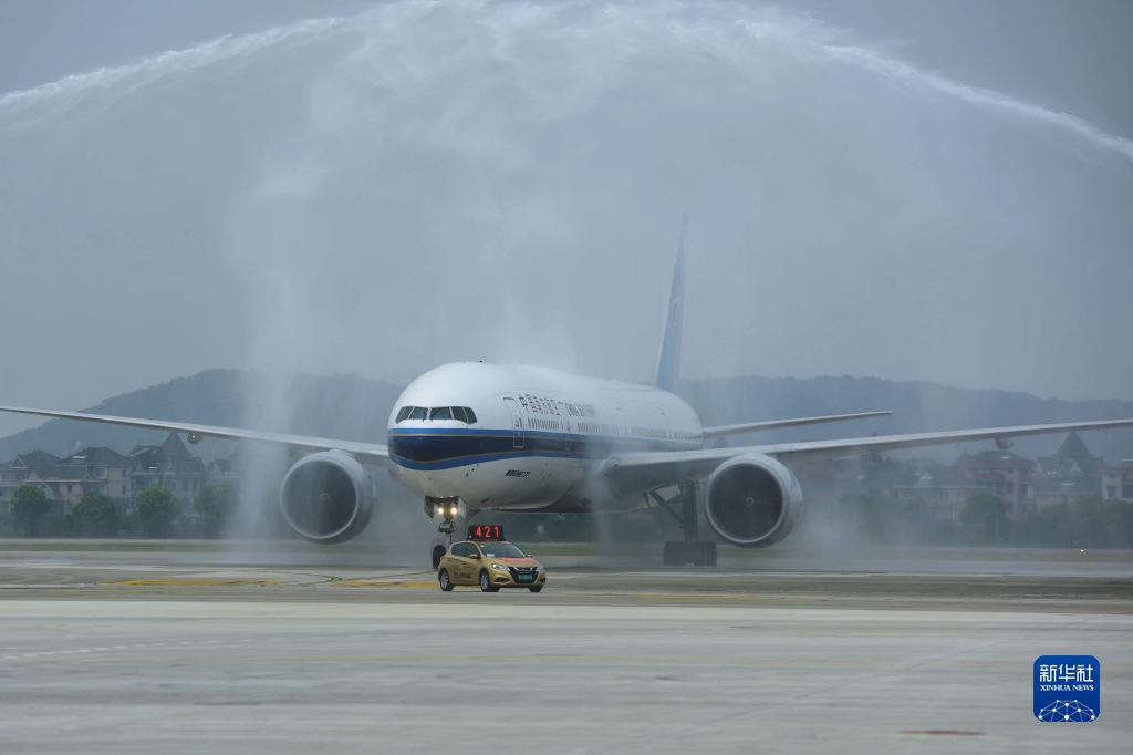 9月22日,杭州蕭山國際機場(chǎng)三期T4航站樓首個(gè)進(jìn)港航班通過(guò)水門(mén)。