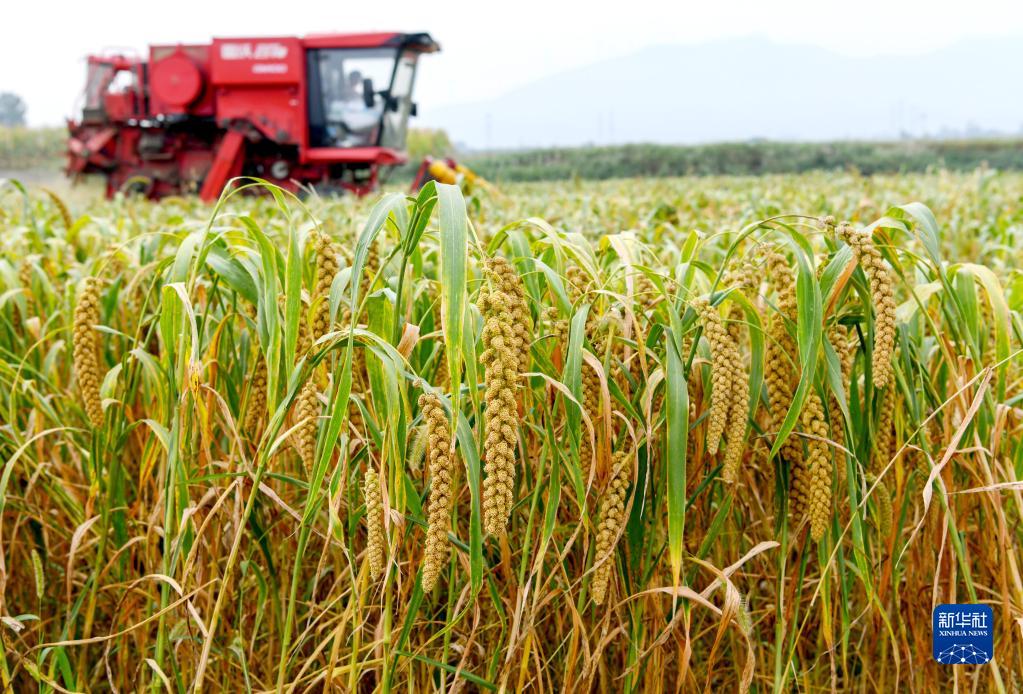 9月21日,在河南省洛陽(yáng)市伊濱區寇店鎮二教塔社區,收割機在地里收割谷子。