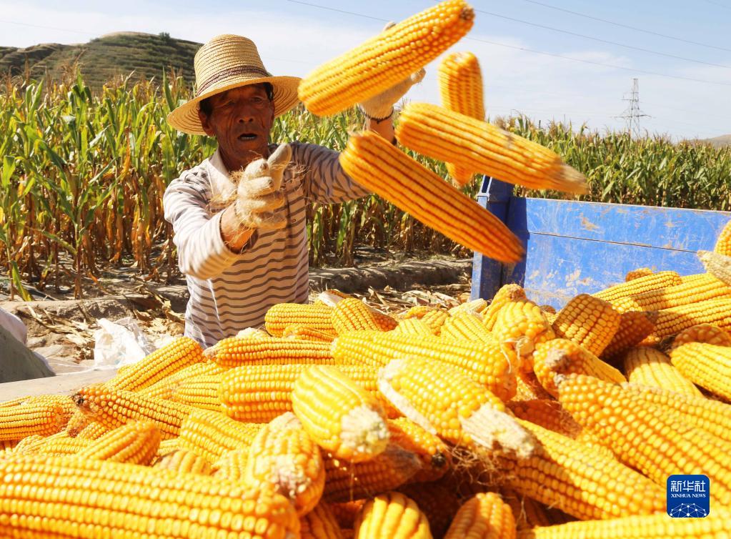 9月22日,在甘肅省定西市安定區西鞏驛鎮鏵尖村,村民將收獲的玉米裝車(chē)。