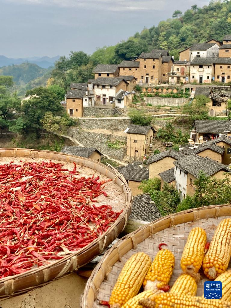 9月23日在安徽省黃山市歙縣陽(yáng)產(chǎn)土樓拍攝的曬秋圖景。