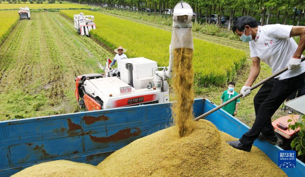 在上海松江區泖港鎮胡光村上海匯民專(zhuān)業(yè)合作社,聯(lián)合收割機將收獲的“松早香1號”稻米輸送到拖拉機貨箱內(9月2日攝,無(wú)人機照片)。得益于農業(yè)科技改良技術(shù),被市民稱(chēng)為“國慶稻”的“松早香1號”稻米九月初成熟收割,市民在國慶節前就能品嘗當年的新米。