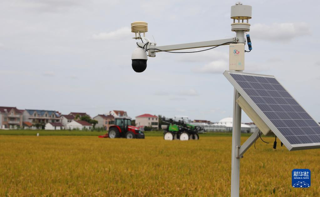 在上海浦東新區宣橋鎮腰路村,滬早粳193稻田邊安裝了5G監測設備(9月21日攝)。這個(gè)村的5G網(wǎng)絡(luò )覆蓋稻田,使得無(wú)人收割機可以快捷高效完成稻米收割。