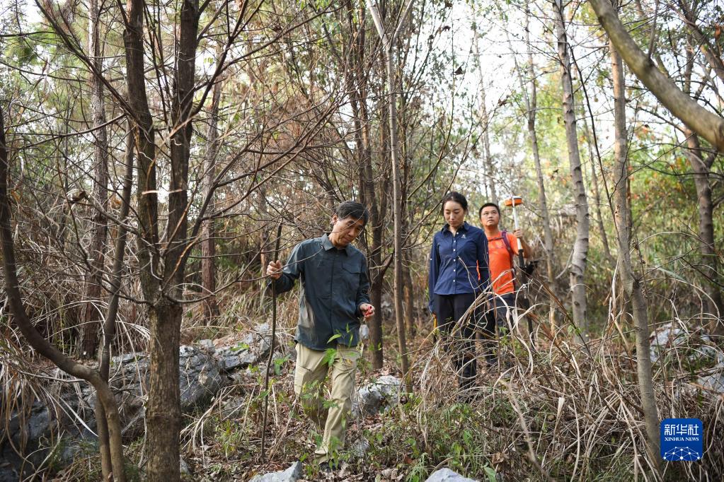 9月21日,在廣東韶關(guān)樂(lè )昌市秀水鎮大羅嶺村,白拉曲珍(中)和師傅江建發(fā)(前)、同事伍國清在石漠化生態(tài)恢復監測平臺固定樣地工作。