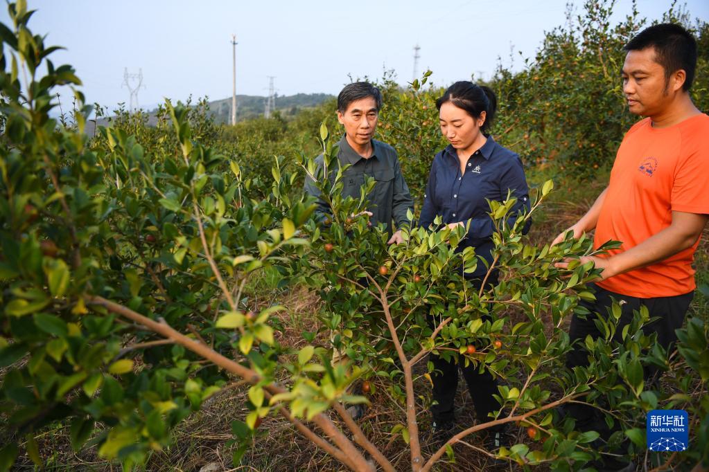 9月21日,在廣東韶關(guān)樂(lè )昌市梅花鎮梅花村,白拉曲珍(中)和師傅江建發(fā)(左)、同事伍國清在石漠化綜合治理的油茶種植基地查看油茶生長(cháng)情況。