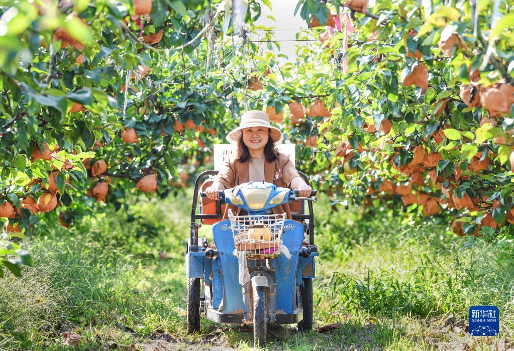9月22日,在山東省膠州市膠北街道王家莊村秋月農場(chǎng)的梨園里,“80后”王慧芬駕三輪車(chē)前來(lái)采摘。王慧芬大學(xué)畢業(yè)后回到老家發(fā)展梨樹(shù)種植。今年,她種植的200畝“小甜梨”豐收在望。