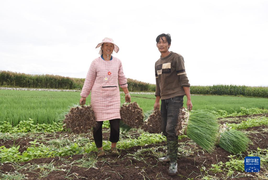 9月22日,在云南省麗江市玉龍縣黃山街道的農田里,“80后”菜農楊志萍(左)和王曉林(右)夫婦在采收小蔥。在租種的10多畝地上,夫婦倆主要種植小蔥、白菜、萵筍等高原生態(tài)綠色蔬菜,今年預計收入10多萬(wàn)元。