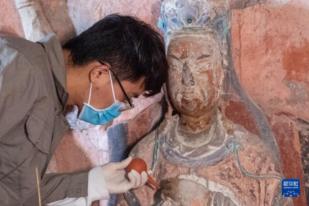 9月22日,大足石刻研究院保護工程中心的工作人員對舒成巖摩崖造像進(jìn)行本體修復。