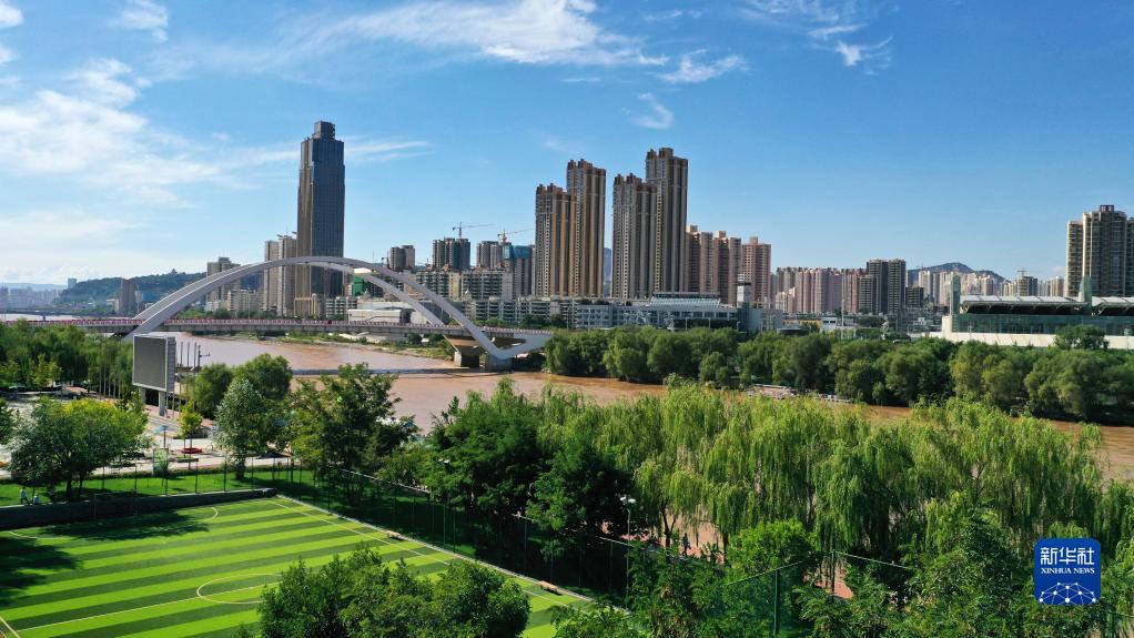 這是黃河蘭州段城市風(fēng)光(2022年9月5日攝,無(wú)人機照片)。新華社記者 陳斌 攝