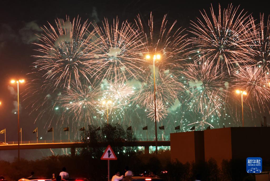 當日,沙特多地燃放煙花,慶祝國慶日。