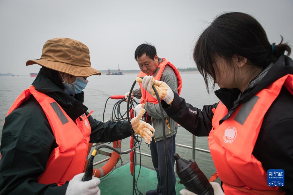 9月23日,科考人員在湖北石首水域通過(guò)微型聲信號記錄儀進(jìn)行探測工作。