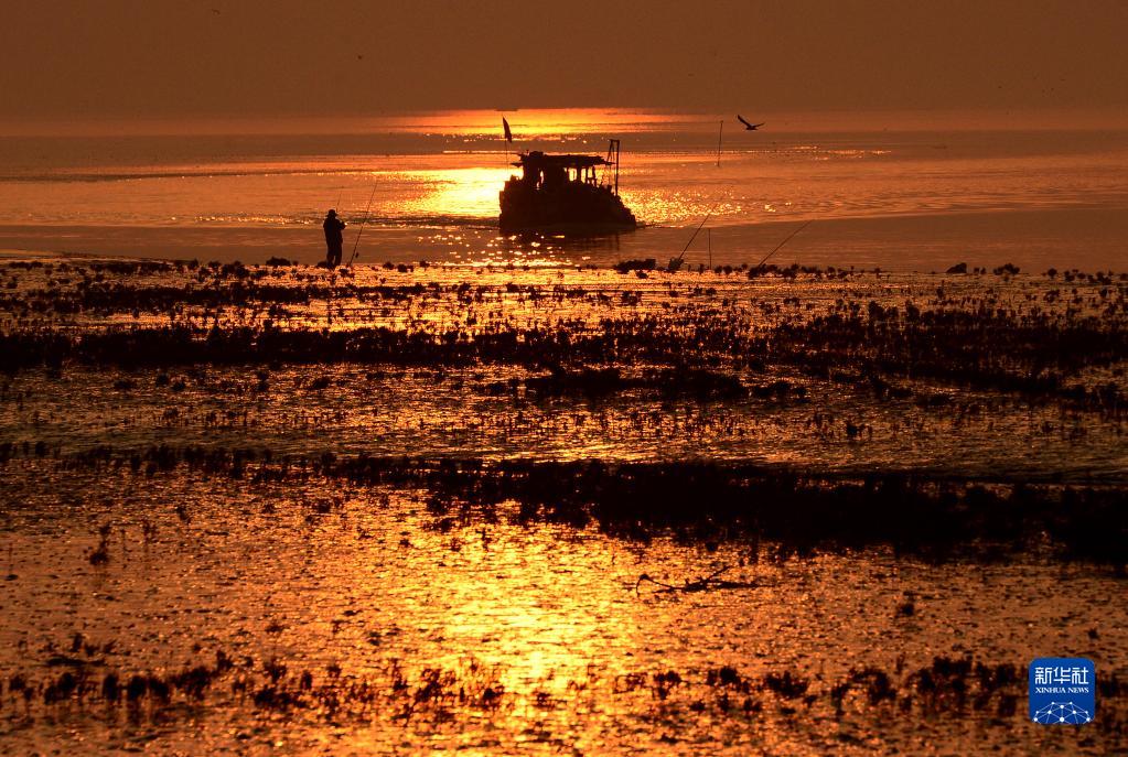 9月18日在山東黃河三角洲國家級自然保護區拍攝的夕陽(yáng)下的濕地景色。