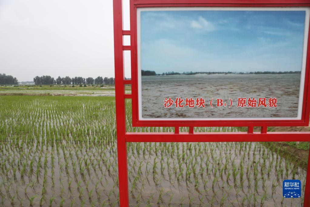 這是2022年6月13日拍攝的阜新市彰武縣大冷鎮上三家子村的稻田及此塊土地原始風(fēng)貌展板。