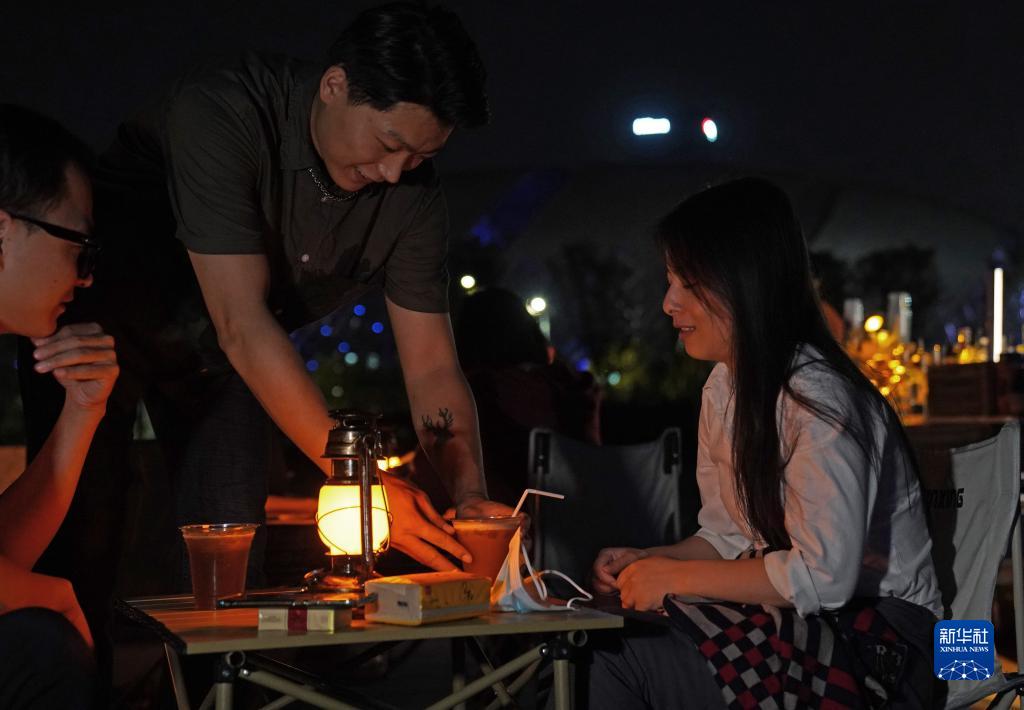 在南昌市紅谷灘區的一處空地,呂琦飛(中)為客人送上一杯調制的飲料(9月22日攝)。