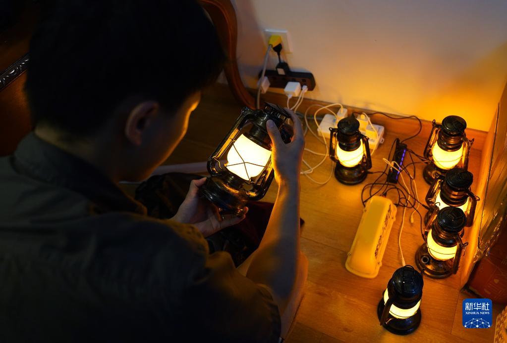 在南昌市紅谷灘區的一處公寓里,呂琦飛給露營(yíng)燈充電(9月22日攝)。