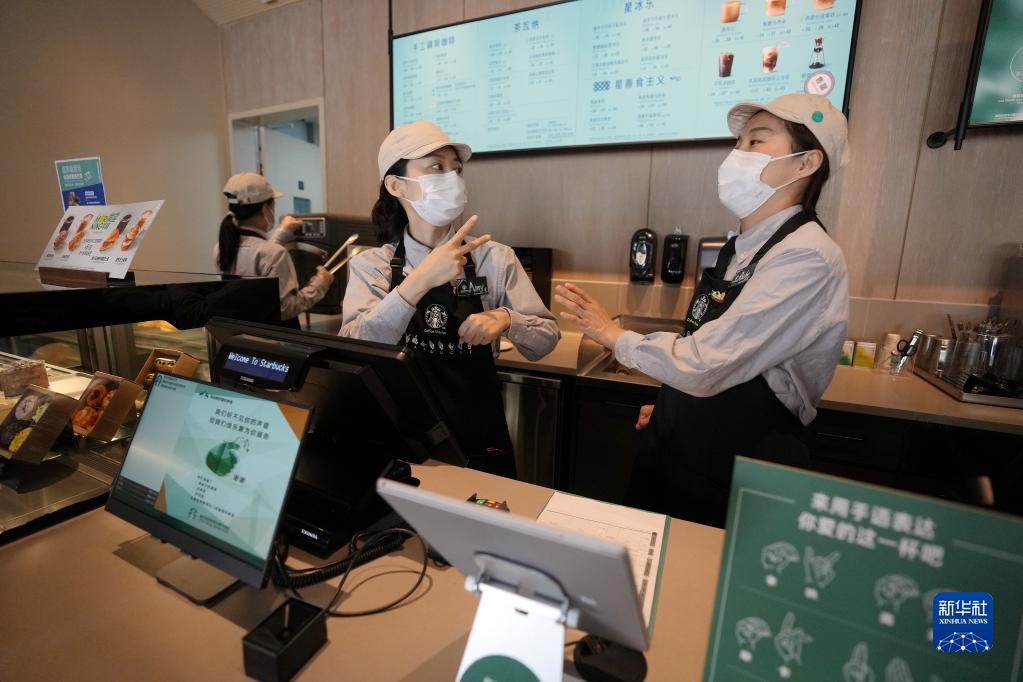 7月4日,在星巴克西安翠華里手語(yǔ)店,“無(wú)聲咖啡師”公益培訓項目學(xué)員、聽(tīng)障咖啡師王茹(右)和聽(tīng)障咖啡師李莎通過(guò)手語(yǔ)交流。
