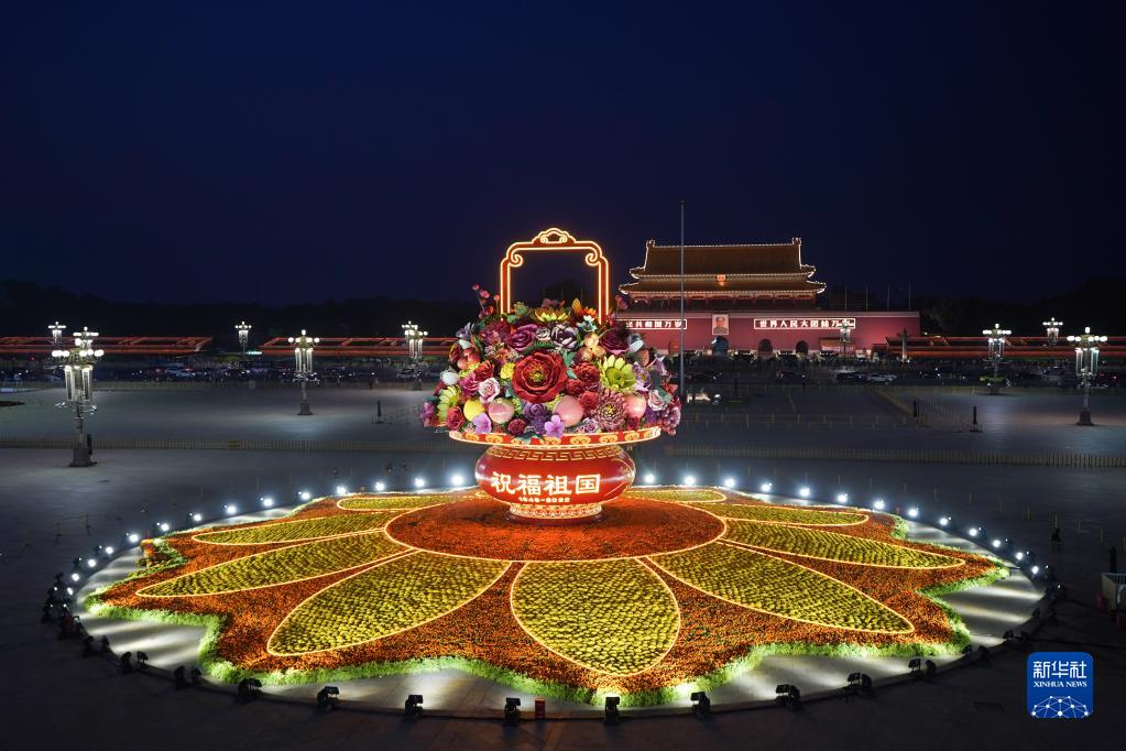 國慶節臨近,“祝福祖國”巨型花果籃亮相北京天安門(mén)廣場(chǎng)。今年“祝福祖國”巨型花果籃頂高18米,以喜慶的花果籃為主景,花壇底部直徑48米。