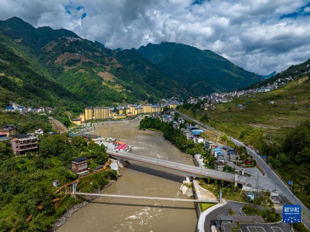 這是2022年9月14日拍攝的怒江州福貢縣行云橋(前)。該橋是連接兩岸的一座步行橋,和沿江木棧道連為一體,滿(mǎn)足群眾出行和休閑需求。旁邊是一座供車(chē)輛通行的大橋(無(wú)人機照片)。新華社記者 江文耀 攝