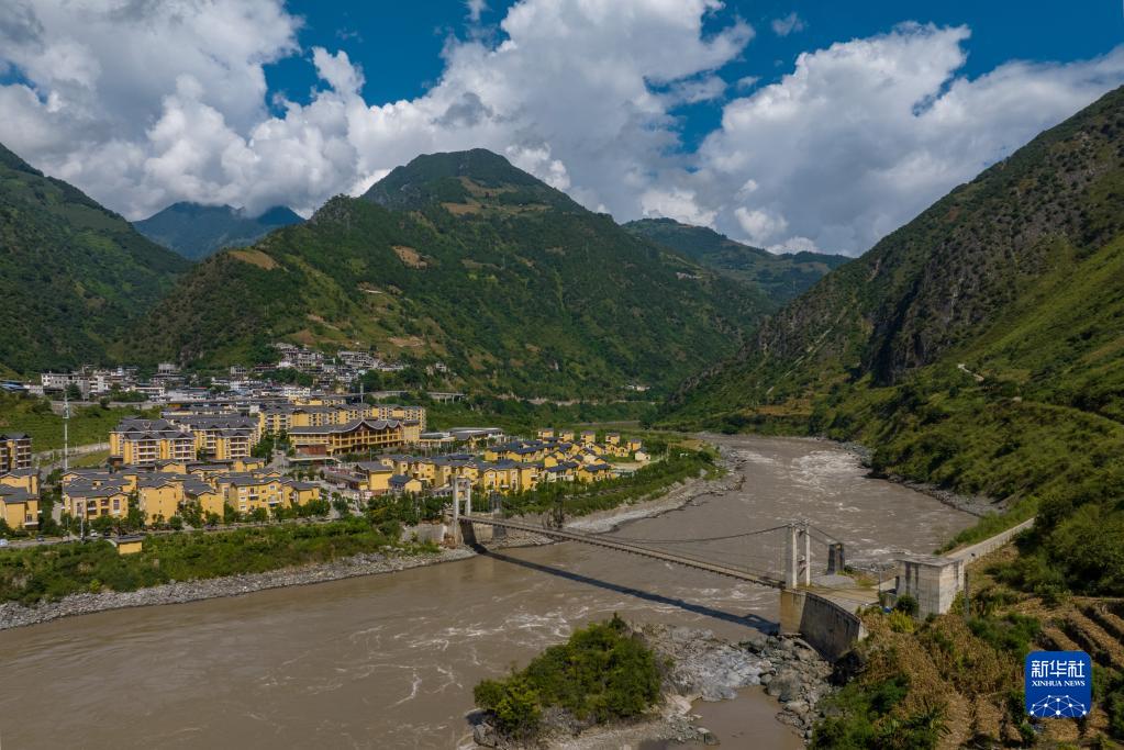 這是2022年9月13日拍攝的怒江州瀘水市維拉壩幸福橋。這座橋連接著(zhù)居民安置點(diǎn)與農業(yè)生產(chǎn)區(無(wú)人機照片)。新華社記者 江文耀 攝