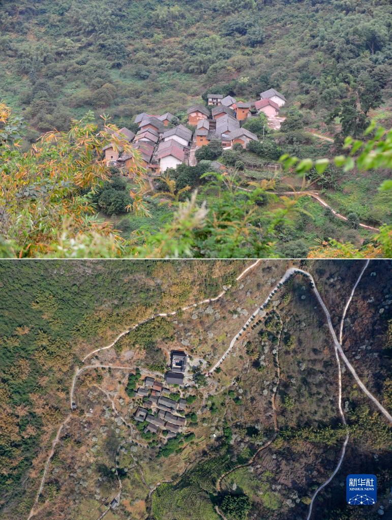 上圖為2012年10月21日拍攝的廣西融安縣東起鄉崖腳村銅板屯;下圖為2021年2月12日拍攝的銅板屯(無(wú)人機照片)。銅板屯曾是當地有名的“空心村”,一度只有6位老人留守,整個(gè)村莊瀕臨消逝。10年來(lái),在當地政府的扶持下,返鄉青壯年實(shí)施“故鄉拯救計劃”,發(fā)展生態(tài)觀(guān)光旅游產(chǎn)業(yè)。如今,銅板屯面貌發(fā)生翻天覆地的變化,已成為當地的“網(wǎng)紅村”(拼版照片)。