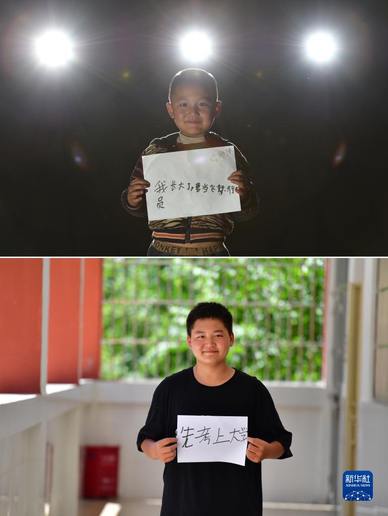 上圖:在廣西大化瑤族自治縣板升鄉弄勇小學(xué),8歲的劉順杰展示自己的夢(mèng)想(2015年1月28日攝);下圖:已經(jīng)到縣城讀初中的劉順杰希望自己能考上大學(xué)(2022年7月26日攝)(拼版照片)。