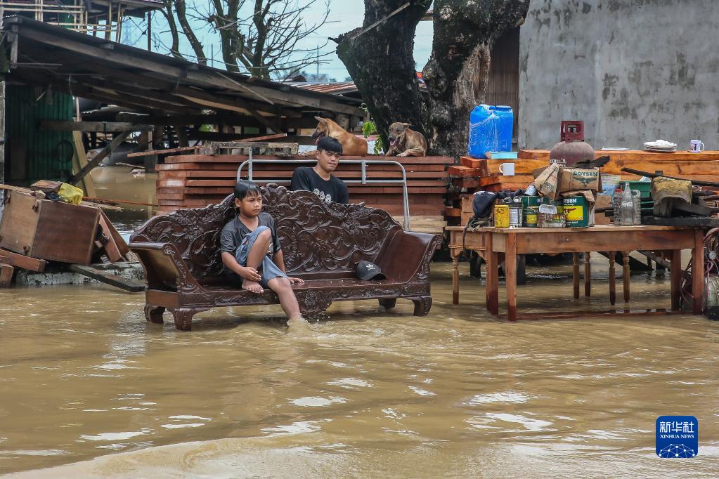 9月26日,在菲律賓布拉干省,兩名居民坐在遭洪水侵襲的住處旁。