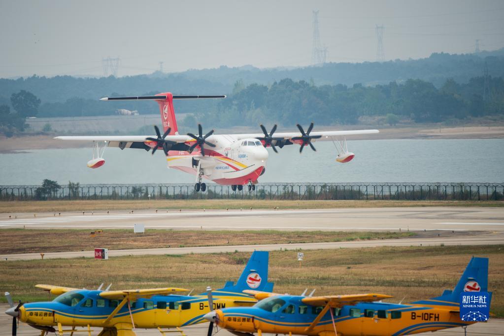 9月27日,“鯤龍”AG600M在漳河機場(chǎng)降落。