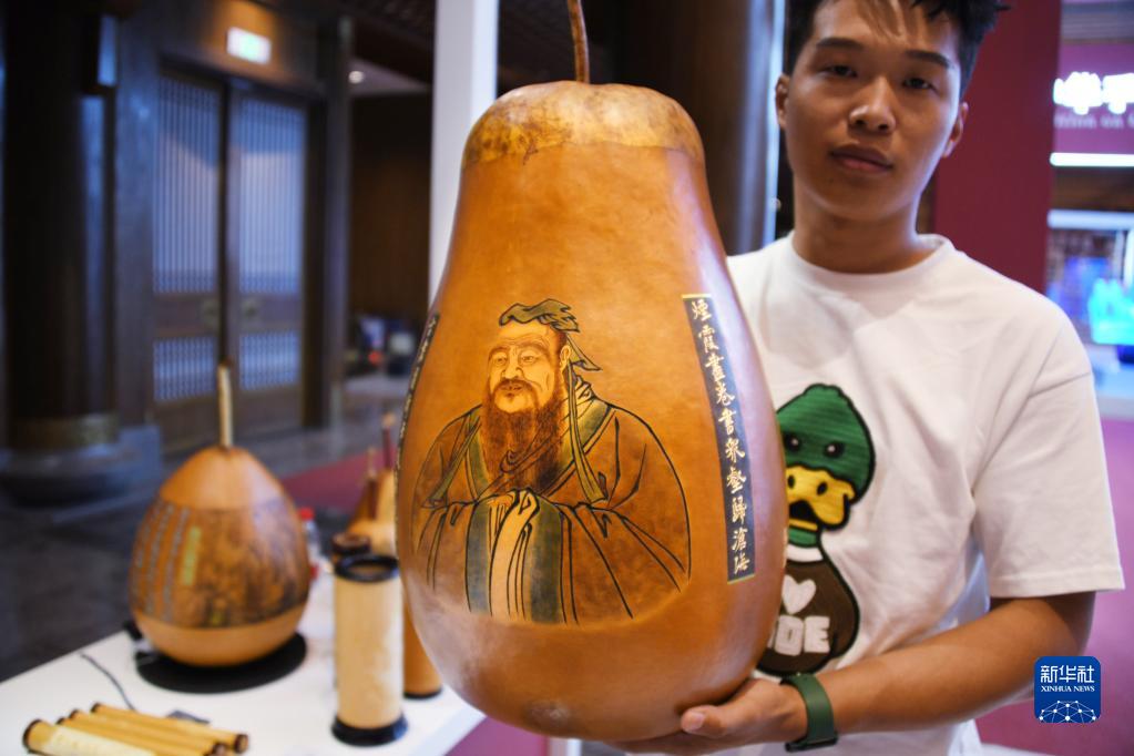 9月26日,葫蘆烙畫(huà)非遺傳承人賈飛展示他創(chuàng )作的葫蘆烙畫(huà)孔子像。
