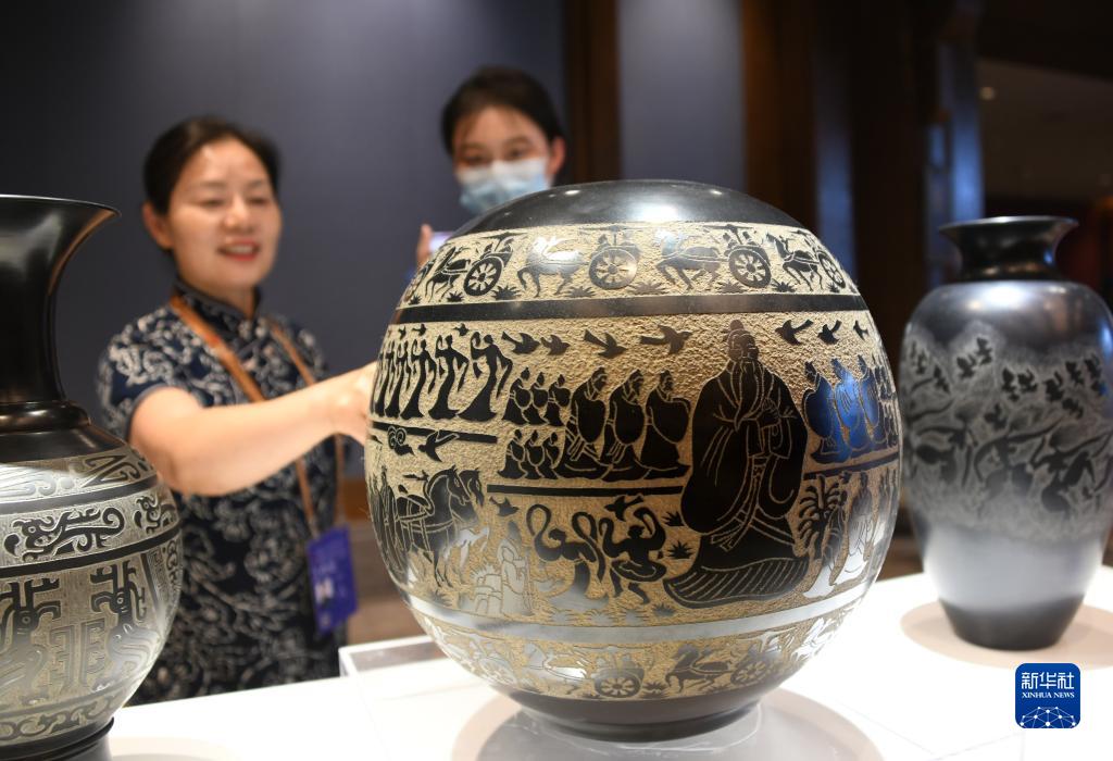 9月26日,觀(guān)眾在觀(guān)看一件刻有孔子像的黑陶作品。