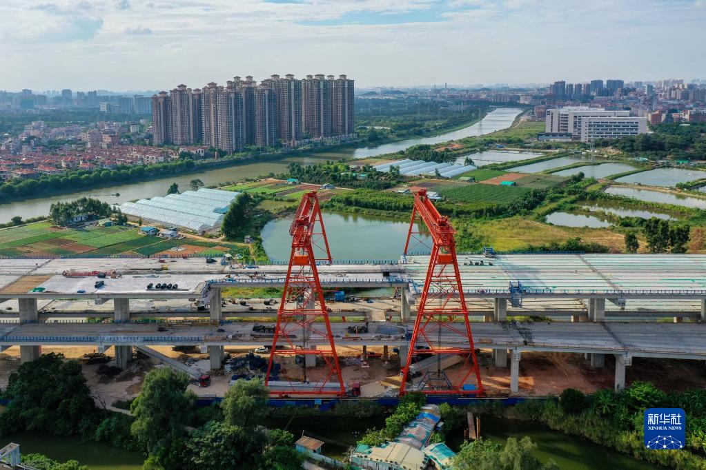 這是9月27日拍攝的莞番高速雙層橋架梁施工現場(chǎng)(無(wú)人機照片)。