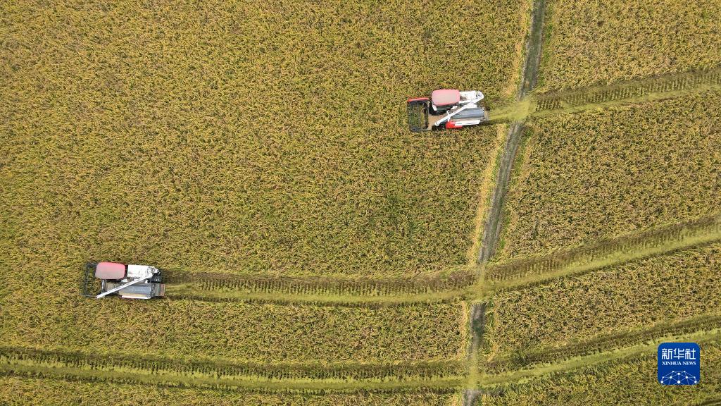 金秋時(shí)節,安徽省合肥市肥西縣花崗鎮河豐社區中稻陸續成熟,當地農民搶抓晴好天氣收割水稻,田間地頭一派豐收景象。