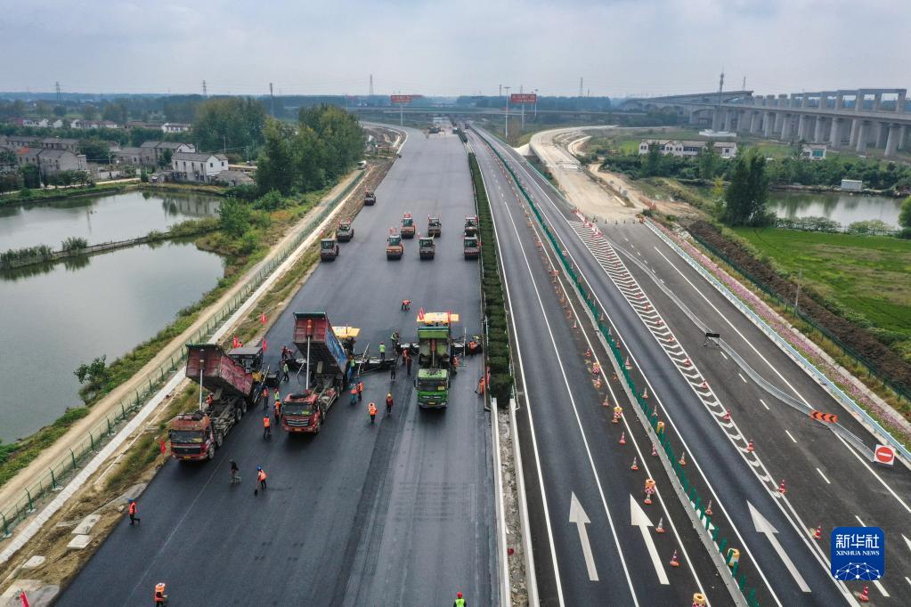 9月28日,京滬高速公路淮安段正在擴建施工中(無(wú)人機照片)。