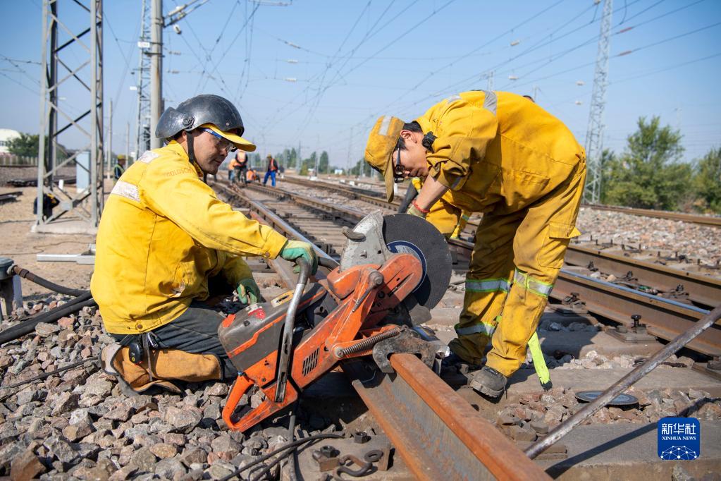 9月28日,中國鐵路太原局集團有限公司大同工務(wù)段工人在大秦線(xiàn)湖東站進(jìn)行施工作業(yè)。