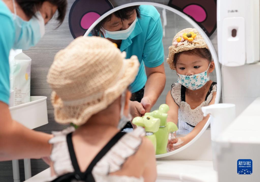 9月27日,在江寧路街道社區黨群服務(wù)中心內的“寶寶屋”,看護人員在指導小朋友洗手。