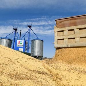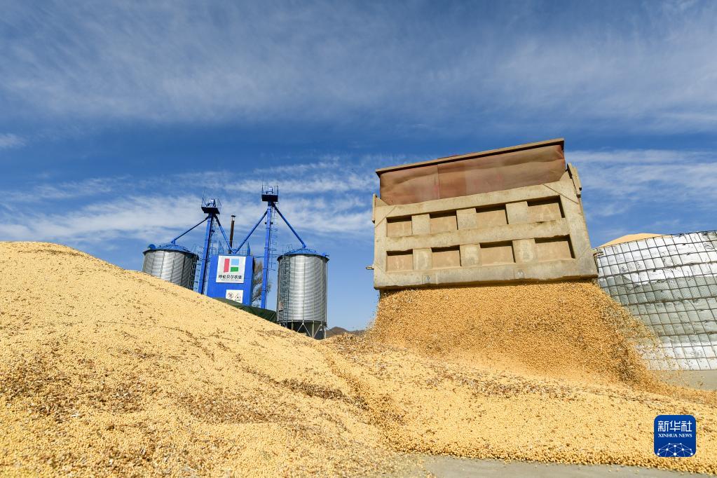 9月28日,在呼倫貝爾農墾綽爾河農牧場(chǎng),工作人員將收獲的大豆卸入晾曬區。