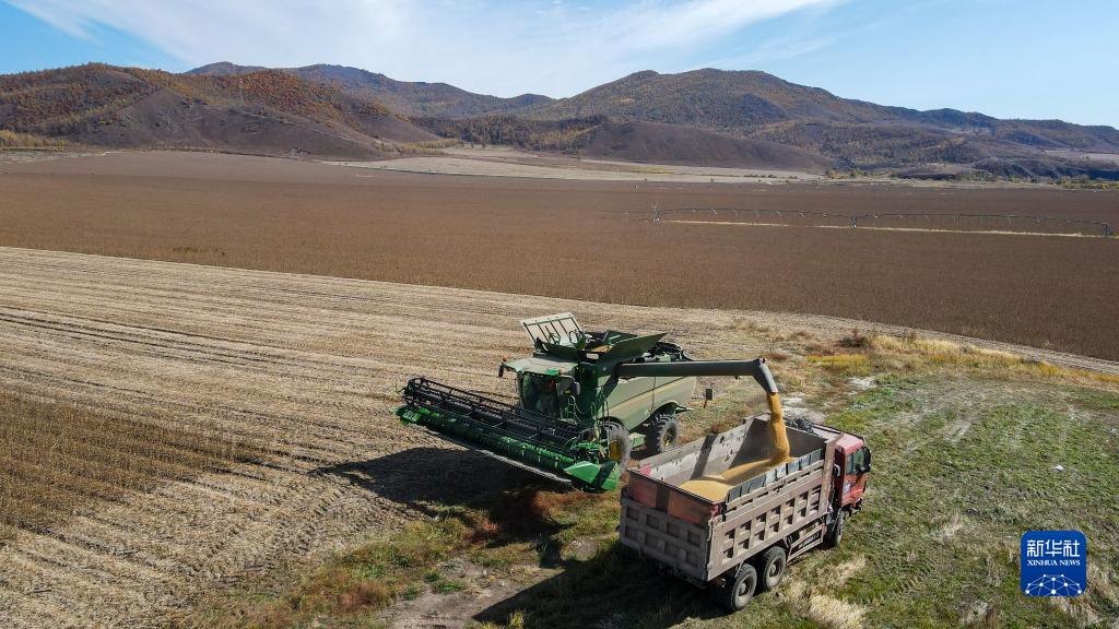9月28日,在呼倫貝爾農墾綽爾河農牧場(chǎng),工作人員駕駛農機將收獲的大豆裝入貨車(chē)(無(wú)人機照片)。