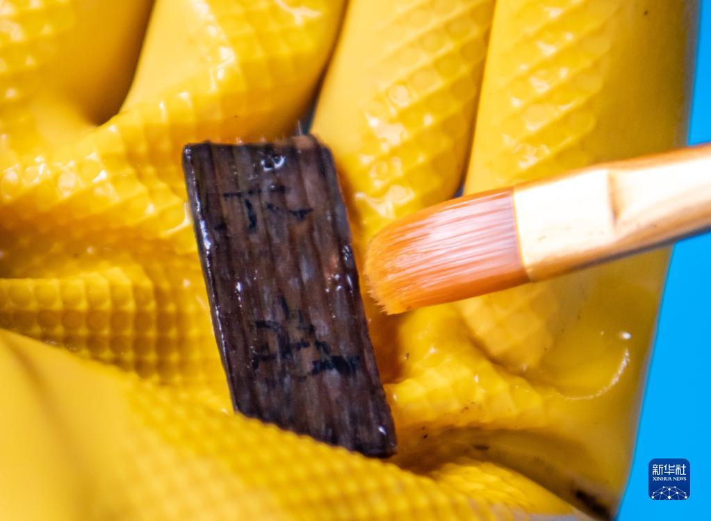 考古工作者在清理云南河泊所遺址出土的簡(jiǎn)牘(2022年9月21日攝)。