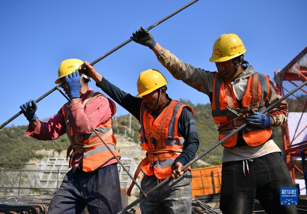 9月28日,中鐵二十局施工人員在位于延安市洛川縣的西延高鐵北洛河特大橋作業(yè)。
