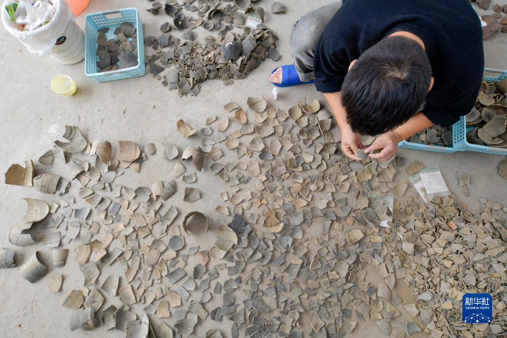 9月27日,考古發(fā)掘隊隊員王朋成在臨時(shí)庫房?jì)?,對此次考古發(fā)掘出土的陶片進(jìn)行清點(diǎn)和拼對。