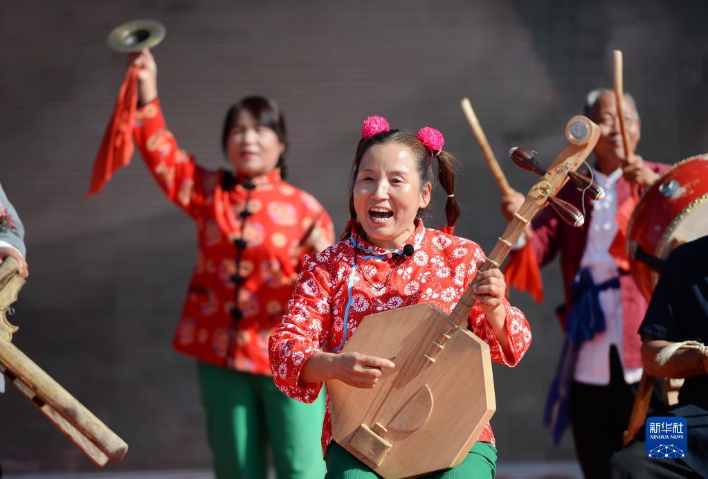 西北綜勘黃河老腔藝術(shù)團藝人在潼關(guān)縣明德公園為群眾表演“黃河老腔”(9月26日攝)。